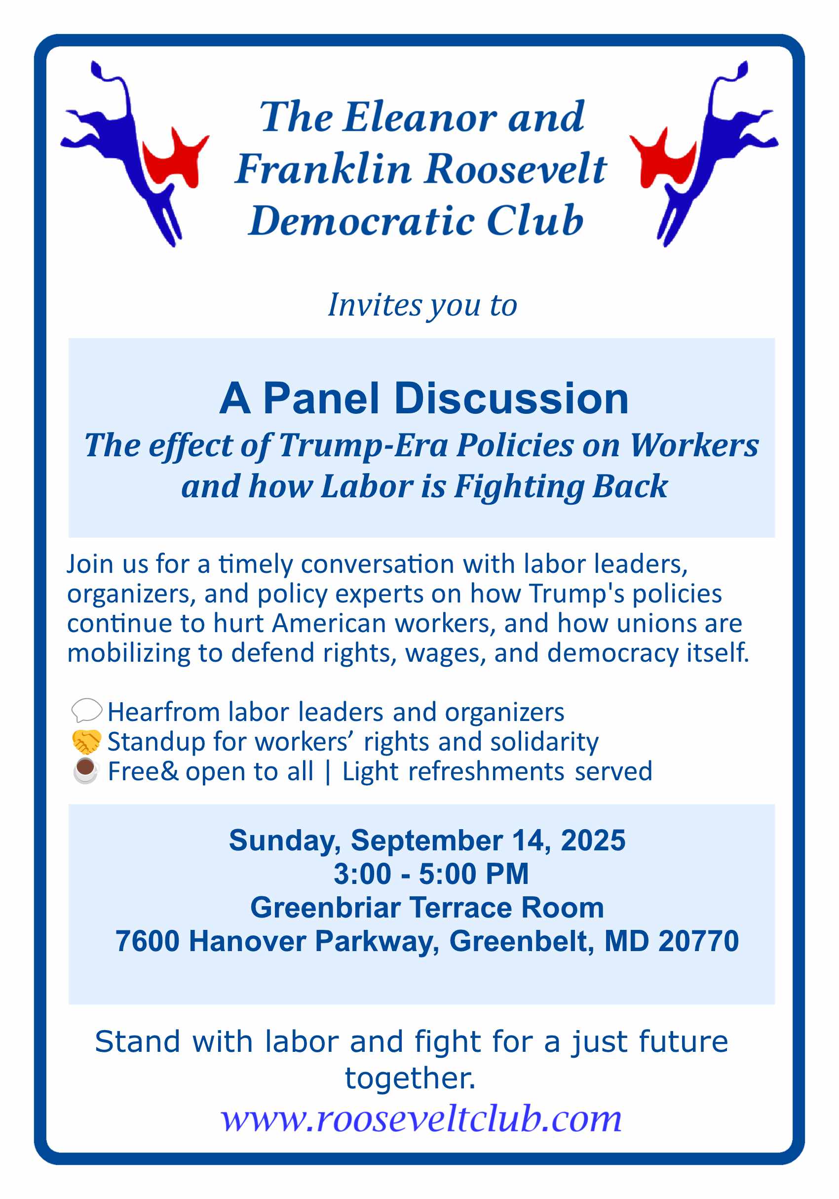 The Greenbelt Labor Day Festival will take place August 29th thru September 1st. The Festival provides opportunities for the Roosevelt Club to raise our profile and to organize for the coming year!!